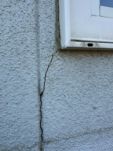 台所で雨漏りが発生していたため、まずは応急処置として外壁のひび割れ(クラック)補修を行いました。外壁のひび割れは放置すると水が浸入し、雨漏りや内部腐食の原因となるため、早期の補修が必要です。