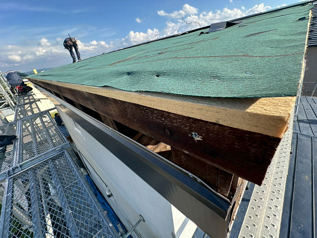 緑色の部分が防水紙(ルーフィング)です。屋根の下地を守り、雨漏りを防ぐ役割があります。