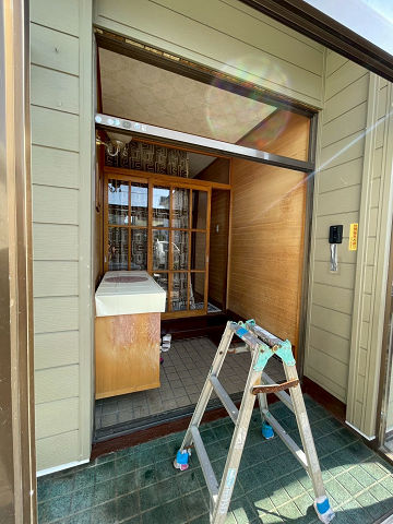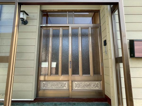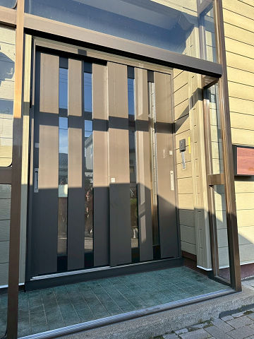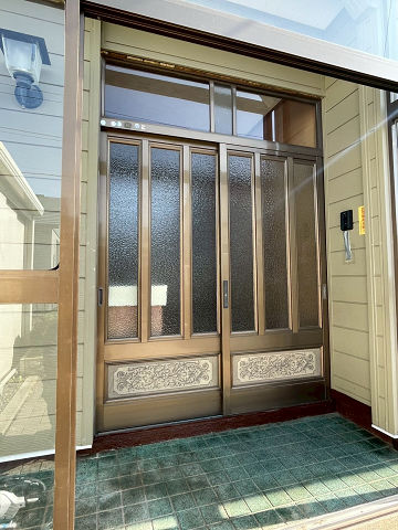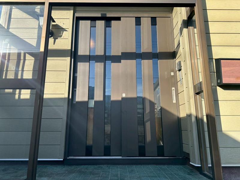 最初は引戸から片開きドアへの交換をご希望でしたが、風除室にぶつかるため、引戸のまま好みに合わせたデザインのものに交換しました。