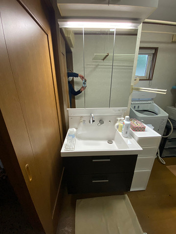 屋根:ガイソールーフガードネオSi(色:R-04)外壁:スレンダラインF(色:クールブラック)玄関ドア:リクシルM77,洗面化粧台:ピアラ