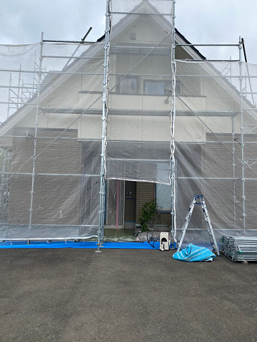 足場を組み、その上から飛散防止ネットを張ることで近隣の建物へ塗料が飛散するのを防ぎます!