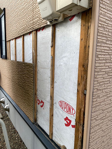 傷んだ外壁材を剥がし新しい外壁材を張っていきます。