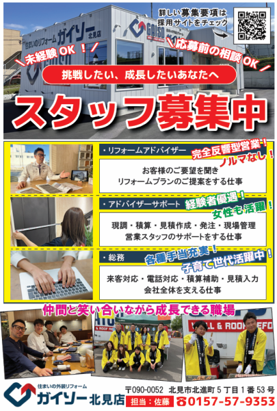 ガイソー北見店では現在、一緒に働いてくれる仲間を募集中です!
