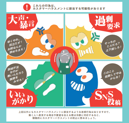 「カスタマーハラスメント」とは、簡単に言うと お客様からの言葉や行動が、普通の範囲を超えてひどく、働く人の仕事や心に悪い影響を与えること です。